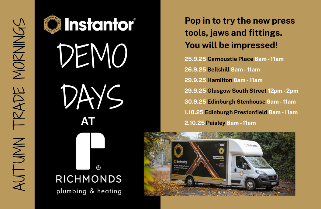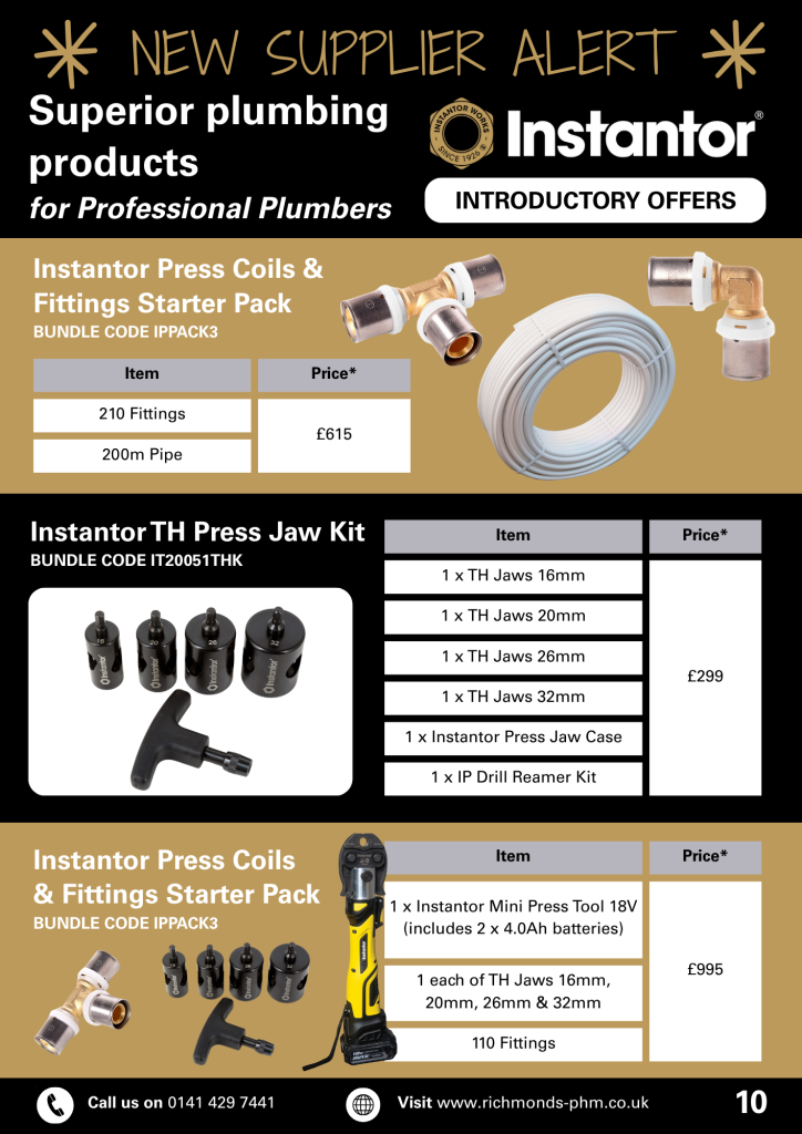 Instantor is an exciting new supplier for Richmonds and, to recognise this, we have three fantastic Instantor introductory offers available in our new dealbook, plumber price. Ask at our Trade Counters for details.