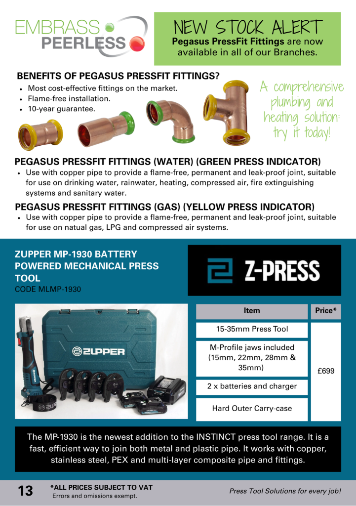 - NEW stock alert for Pegasus Pressfit Fittings from Embrass for both water and gas – the most cost-effective fittings on the market; and